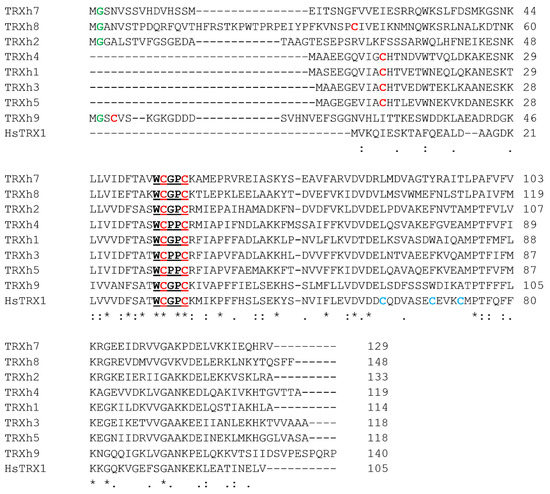 Conserved features of Arabidopsis h-type TRXs and human TRX1 protein sequences. Highlighted in red are the active site Cys residues as well as the N-terminal Cys. The catalytic motif is underlined and additional C-terminal Cys residues unique to HsTRX1 are in blue. Glycine residues that undergo N-myristoylation are in green. Asterisks (*) denote conserved residues, (:) strong and (.) weakly similar amino acid properties.
