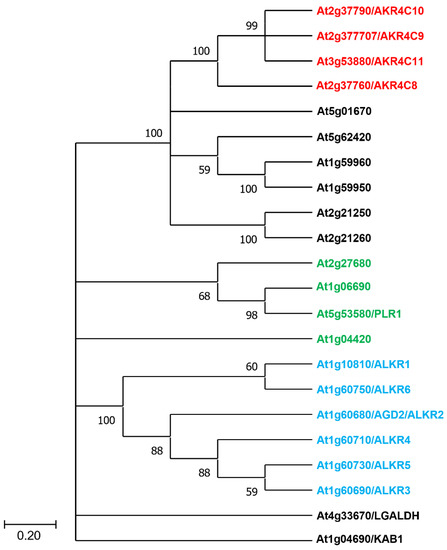 Phylogenetic tree of Arabidopsis AKR proteins. The phylogenetic tree was constructed by searching for aldo-keto reductases (PTHR11732) in the PANTHER database and using the MEGA 11 program with bootstrap test (1000 times) and the neighbor-joining method. Highlighted in red are the four members of the subclass 4C, while marked in blue are AKR proteins that lack the Lys residue in their catalytical tetrad. Green denotes AKR proteins that show an N-terminal extension, indicating they may localize to chloroplasts or mitochondria. In addition to the AGI identifiers, other names given to each AKR are shown.