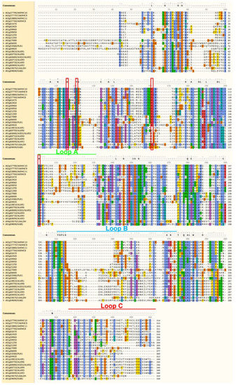 Multiple sequence alignment of AKRs from Arabidopsis. Red boxes highlight the catalytic tetrad residues, while green, cyan and red bars above the alignment denote the flexible loops defining the active site important for substrate specificity. Elements were assigned using the structural information of Arabidopsis AKR4C8 (PDB code 3h7r). Residues are color-coded based on their properties: red: positive; blue: hydrophobic; green: polar; orange: glycine; purple: negative; teal: aromatic; yellow: proline.