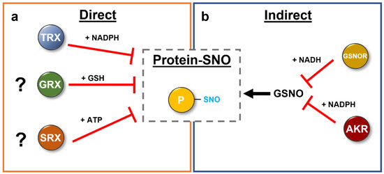 - Benhar, M.; Forrester, M.T.; Stamler, J.S. Protein Denitrosylation: Enzymatic Mechanisms and Cellular Functions. Nat. Rev. Mol. Cell Biol. 2009, 10, 721–732. [Google Scholar] [CrossRef]