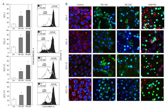 Loss of mitochondrial membrane potential. (A) SCL-I, SCL-II, SCC-12, and SCC-13 were seeded in 24-well pates and were treated with PE (100, 200 µg/mL) for 24 h. Mitochondrial membrane potential (MMP) was determined at 24 h by TMRM+ staining and flow cytometry. Values represent the percentage of cells with low MMP. Right, examples of flow cytometry reading are shown for 200 µg/mL treatment (overlays of treated cells vs. Ctr). Cell populations with low and normal MMP are indicated. One of two independent experiments is shown; each individual experiment consisted of triplicate values. Statistical significance was calculated from all individual values (#6) and is indicated by asterisks (p < 0.05, as compared to Ctr). (B) Cells were treated with PE-100 and PE-200 as well as with DKP-071 (10 µM)in combination with TRAIL (DKP/TR, positive control). For microscopic visualization of low MMP, cells were stained with JC-1 and counterstained with Hoechst-33342 at 24 h of treatment. Blue, nuclear staining; red, mitochondria with high (normal) MMP; faint green, JC-1-stained cytosol; bright green or turquoise, rounded and detached cells.