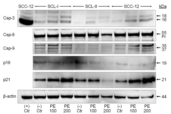 To identify protein factors that may mediate apoptosis induction as well as inhibition of cell proliferation and cell viability by PE, the cell cycle inhibitors p19 and p21, the main effector caspase-3 as well as proapoptotic initiator caspases (−8 and −9) were investigated by Western blotting (Figure 4). Some induction of caspase-3 processing was seen in response to PE treatment (characteristic cleavage products of 18 and 16 kDa), indicative of caspase-3 activation. However, this remained on a relatively low level, as seen in comparison with a positive control consisting of SCC-12 cells treated with the indirubin derivative DKP-071 in combination with TRAIL [24]. Semi-quantitative analyses revealed induction factors of 3x − 4x for the active p16 caspase-3 cleavage product after PE treatment, while p16 was induced > 60-fold in the positive control. Similarly, only weak activation was seen for initiator caspases of the proapoptotic extrinsic and intrinsic pathways. Thus, caspase-8 proform was downregulated to 64% in SCL-II by 200 mg/mL PE, and caspase-9 cleavage products (35/37 kDa) were slightly upregulated by 200 µg/mL PE in SCL-I (1.7x) and in SCC-12 (3.7x). The weak caspase processing was in agreement with only moderately induced apoptosis described above.