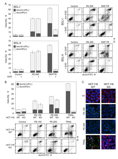 As seen in Figure 2D,E, PE treatment resulted in less increase in early apoptotic cells characterized by AnnV(+)/PI(−), whereas numbers of late apoptotic/necrotic cells characterized by AnnV(+)/PI(+) were strongly increased. To further prove, whether cells may die by apoptosis, i.e., via a caspase-dependent pathway, and to evaluate the possible significance of caspases in PE-induced cell death, the pan-caspase inhibitor Q-VD-Oph was applied in SCL-I and SCL-II, and cell death was evaluated by AnnV/PI staining. When considering AnnV(+)/PI(−) cells (early apoptosis), the applied positive control (DKP-071/TRAIL) induced apoptosis in 30% and 43% of SCL-I and SCL-II cells, respectively. This proapoptotic effect was completely prevented by 10 µM Q-VD-Oph (Figure 5A). Similarly, induction of AnnV(+)/PI(+) cells by DKP-071/TRAIL was strongly reduced in SCL-I and was prevented in SCL-II by Q-VD-Oph, indicating late apoptotic (secondary necrotic) cells. In contrast, cell death induced by PE-200 was not significantly decreased by Q-VD-Oph, indicating also caspase-independent and non-apoptotic pathways induced by PE.