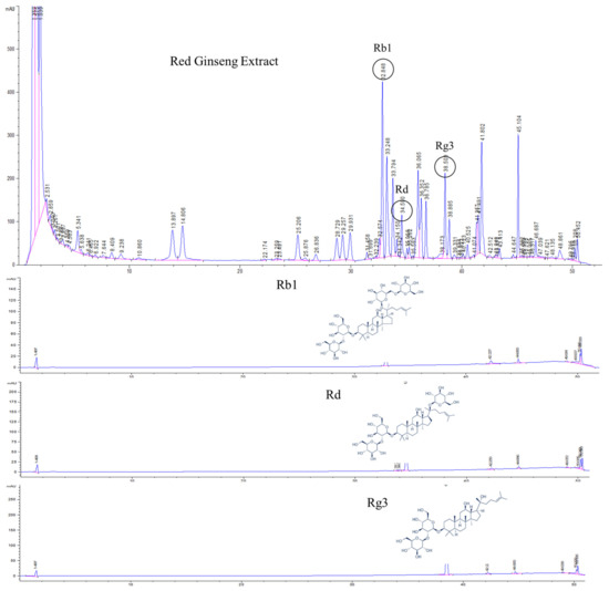 HPLC analysis of KRG was carried out with a UV detector for quantitative analysis of the major ginsenosides. The analytes were fully separated within 60 min, and a representative chromatogram is shown in Figure 1. The retention times for each ginsenoside were approximately 32.8 (Rb1), 34.5 (Rd), and 38.5 (Rg3) min. According to the optimized HPLC–UV analysis, the amounts of Rb1, Rd, and Rg3 in KRG were 6.7, 1.0, and 1.5 mg/g, respectively.