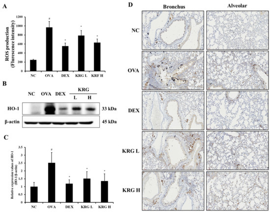 Korean red ginseng (KRG) reduces the levels of reactive oxygen species (ROS) production (A) in the bronchoalveolar lavage fluid (BALF) and expression of heme oxygenase-1 (HO-1) (B) in the lung tissues, of which (C) densitometric values were determined utilizing Chemi-Doc. (D) HO-1 expression in the bronchus and alveolar regions of lung tissues was revealed by immunohistochemistry (IHC). Normal control (NC) group; mice administered with the vehicle, ovalbumin (OVA), group; mice treated with OVA and administered with the vehicle, dexamethasone (DEX), group; mice treated with OVA and administered with dexamethasone (3 mg/kg); KRG low (KRG L) and high (KRG H) groups; mice treated with OVA and administered with KRG (100 and 300 mg/kg, respectively). Values: means ± standard deviation (n = 6). Significance: # p < 0.05 vs. NC; * p < 0.05 vs. OVA.