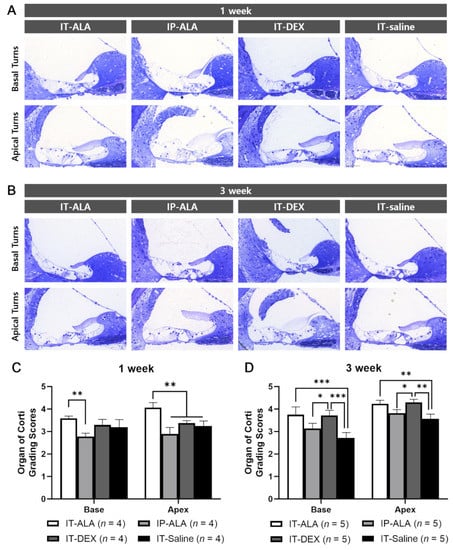 - Han, M.A.; Back, S.A.; Kim, H.L.; Park, S.Y.; Yeo, S.W.; Park, S.N. Therapeutic Effect of Dexamethasone for Noise-induced Hearing Loss: Systemic Versus Intratympanic Injection in Mice. Otol. Neurotol. 2015, 36, 755–762. [Google Scholar] [CrossRef] [PubMed]