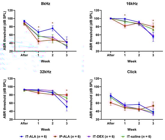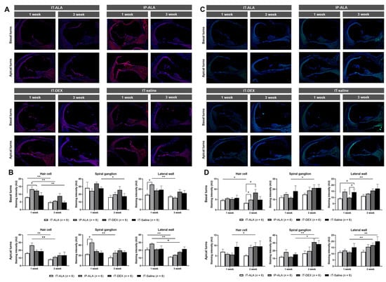 Chicago/Turabian StyleHan, Jae Sang, Ye Lin Kim, Hyo Jeong Yu, Jung Mee Park, Yeonji Kim, So Young Park, and Shi Nae Park. 2022. "Safety and Efficacy of Intratympanic Alpha-Lipoic Acid Injection in a Mouse Model of Noise-Induced Hearing Loss" Antioxidants 11, no. 8: 1423. https://doi.org/10.3390/antiox11081423