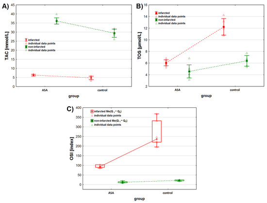 Oxidative stress markers levels in infarcted and the non-infarcted tissues collected from the left ventricle of the heart of pigs (n = 13) subjected to a myocardial ischemia-reperfusion protocol assessing the effectiveness of intracoronary administered acetylsalicylic acid (ASA): (A) total antioxidant capacity (TAC) [mmol/L], (B) total oxidative status (TOS) [µmol/L] and (C) oxidative stress index (OSI) [index]. Results in (A,B) are presented as mean ± 95% confidence interval and in (C) as median (lower, upper quartile) and minimum and maximum. In all figures, triangular markers represent the raw data. For the reader’s convenience, the points are connected with dashed lines.