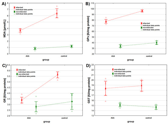 Oxidative stress markers levels in infarcted and the non-infarcted tissues collected from the left ventricle of the heart of pigs (n = 13) subjected to a myocardial ischemia-reperfusion protocol assessing the effectiveness of intracoronary administered acetylsalicylic acid (ASA): (A) malondialdehyde (MDA) concentration [µmol/L], (B) glutathione peroxidase (GPx) activity [IU/mg protein], (C) glutathione reductase (GR) activity [IU/mg protein] and (D) glutathione S-transferase (GST) activity [IU/mg protein]. The results are presented as mean ± 95% confidence interval and triangular markers represent the raw data. For the reader’s convenience, the points are connected with dashed lines.
