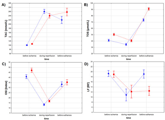 Oxidative stress marker levels in the serum of pigs subjected to a myocardial ischemia-reperfusion protocol assessing the effectiveness of intracoronary administered acetylsalicylic acid (ASA): (A) total antioxidant capacity (TAC) [mmol/L], (B) total oxidative status (TOS) [µmol/L], (C) oxidative stress index (OSI) [index] and (D) lipofuscin (LF) concentration [RF]. The results are presented as mean ± 95% confidence interval and, for the reader’s convenience, the points are connected with dashed lines.