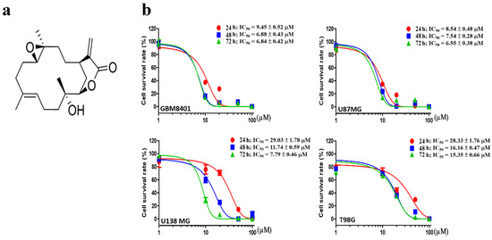 The effects of sinularin on brain cancer cell viability. (a) Chemical structure of sinularin. (b) Concentration–response curves of cell viability for GBM 8401, U87 MG, U138 MG, and T98G after 24, 48, and 72 h of sinularin treatment as well as determined IC50 values. Each bar represents the mean ± standard error of the mean.