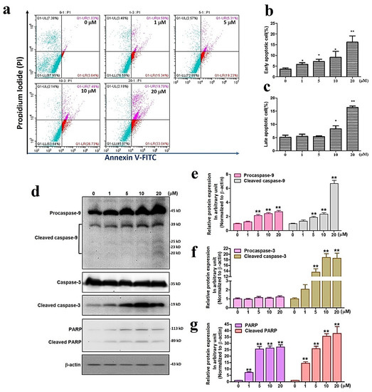 We subsequently analyzed the proportion of apoptotic cells resulting from sinularin in U87 MG cells. The annexin V/propidium iodine (PI) staining method was used to assess early and late apoptosis. In the annexin V/PI chart, the upper right quadrant identifies a population of late apoptotic cells, while the lower right quadrant indicates the early apoptotic cells. Our findings show that early apoptotic cells were significantly increased at 1 μM of sinularin and above concentrations, whereas a significant increase was observed at 10 μM and above concentrations (Figure 2a–c). Considering these increased numbers of early and late apoptotic cells, we subsequently evaluated the apoptosis markers caspase 9/3 and the DNA damage marker poly ADP-ribose polymerase (PARP). Our results reveal that the expression levels of cleaved caspase 9/3 and PARP were significantly increased with 5 μM of sinularin and above concentrations (Figure 2d–g). Together, these findings indicate sinularin-induced apoptosis and DNA damage via the activation of caspase 9/3 and PARP.