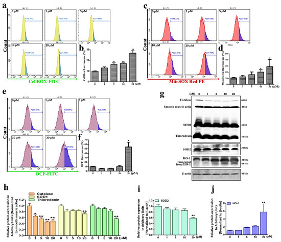 Considering the ability of sinularin to induce ROS in cells [19], we next evaluated ROS levels using CellROXTM Green, MitoSOXTM Red, and CM-H2DCFDA staining methods following 24 h of sinularin treatment in U87 MG cells. CellROXTM Green is used to detect ROS in mitochondria and the nucleus, while MitoSOXTM Red identifies mitochondrial O2•− levels and CM-H2DCFDA detects ROS levels intracellularly [17,19]. Our results showed that CellROXTM Green signals were significantly elevated upon treatment with sinularin at 5 μM and above concentrations (Figure 3a,b), while MitoSOXTM Red signals were significantly elevated with sinularin at 10 μM and above concentrations (Figure 3c,d). The signals for DCF (the oxidation product of CM-H2DCFDA) were significantly elevated with sinularin at 20 μM (Figure 3e,f). These results showed a concentration-dependent increase in ROS levels. We subsequently monitored the expression levels of the antioxidant proteins catalase, SOD1, SOD2, thioredoxin [20], and heme oxygenase 1 (HO-1) [21] (Figure 3g). Our findings demonstrate that the expression levels of catalase, SOD1, SOD2, and thioredoxin were significantly reduced following treatment with sinularin at 20 μM (Figure 3h,i). By contrast, HO-1 levels were significantly increased with sinularin at the same concentration (Figure 3j).