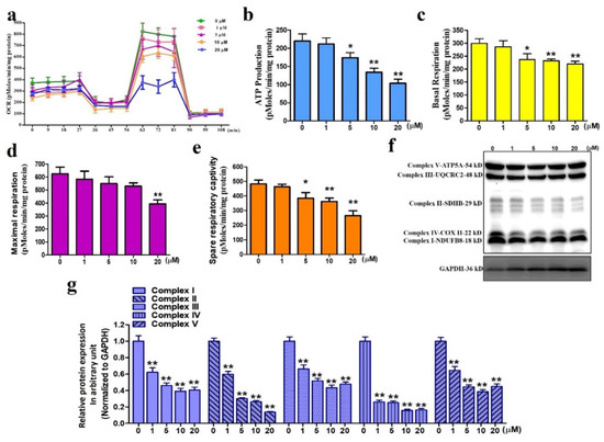 Changes in oxygen consumption rates and enzymatic complexes I to V of the OXPHOS electron transport chain. (a) Measurements of oxygen consumption rates. (b) Analysis of ATP production. (c) Analysis of basal respiration. (d) Analysis of maximal respiration. (e) Analysis of spare respiration capacity. (f) Western blot measurement of the enzymatic complexes I to V. Full, uncropped Western blot gel can be found on Supplementary File Figure S2a. (g) Analysis of the enzymatic complexes I to V. Each bar represents the mean ± standard error of the mean. * p < 0.05 and ** p < 0.01 relative to control.