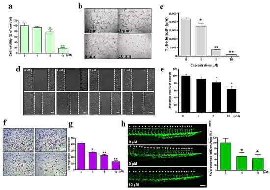 Since Ferrando et al. revealed that HO-1-regulation prevents angiogenesis [22], we next evaluated the antiangiogenic effects of sinularin using the fusion cell line EA.hy926. The viability of EA.hy926 cells was significantly inhibited by sinularin treatment for 24 h at 5 μM and above concentrations (Figure 5a). Moreover, sinularin at 10 μM reduced the VEGF-induced lengthening of vascular tubes in a concentration-dependent manner, as revealed using the tube formation assay with human umbilical vein endothelial cells (HUVEC) (Figure 5b,c). Using the wound healing assay, the mobility of EA.hy926 cells was also found to be altered by sinularin in a dose-dependent manner after 18 h, with a significant effect observed at 5 μM and above concentrations (Figure 5d,e). Likewise, using the transwell migration assay, the numbers of migrated EA.hy926 cells were reduced by sinularin in a dose-dependent manner, with a significant effect observed at 1 μM and above (Figure 5f,g). A zebrafish model was next used to investigate vessel formation after sinularin treatment. We assessed the effects of sinularin at 0, 5, and 10 μM on the formation of intersegmental vessels (ISVs) in transgenic Tg(fli1:EGFP) angiofluorescent zebrafish larvae. Our results demonstrate that sinularin inhibits the angiogenesis of intersegmental blood vessels in zebrafish larvae (Figure 5h,i).