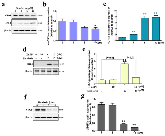 The strong effect of sinularin at preventing angiogenesis in human endothelium cells and zebrafish prompted further investigation of the expression levels of angiogenic factors such as endothelial nitric oxide synthase (eNOS) in addition to HO-1 in EA.hy926 cells. Our Western blot results showed that the expression levels of eNOS decreased while those of HO-1 increased in EA.hy926 cells after 24 h of treatment with sinularin (Figure 6a–c). Subsequently, we pretreated the cells with a HO-1 inhibitor, zinc protoporphyrin (ZnPP). Our findings indicate that the sinularin-induced upregulation of HO-1 was significantly dampened by ZnPP, further supporting the ability of sinularin to increase HO-1 expression (Figure 6d,e). We also found that VEGF expression levels were significantly decreased by sinularin at 5 μM and above concentrations (Figure 6f,g).