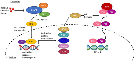 The Nrf2 pathway and downstream effectors. Note the inhibition of the KEAP1 complex by ROS to promote the release of Nrf2 for subsequent nuclear translocation and transcription of antioxidant proteins. Downstream, HO-1 inhibits NF-κB signaling to downregulate the inflammatory response.