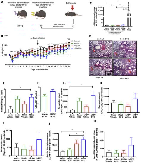 3.2. Previous hRSV Infection Causes Further Long-Term Susceptibility to Mycobacterium Bovis-Driven Pneumonia