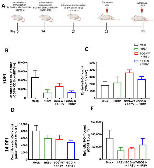 3.4. rBCG-N-hRSV Immunization Promotes a Higher Induction of HO-1 on Epithelial Cells than in DCs at Late Infection Times