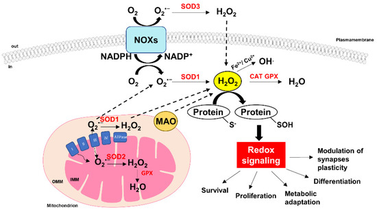 The idea that ROS represent the dark side of energy consumption has now been challenged and, although the mechanisms are still puzzling, we know that ROS also mediate different cellular signaling under physiological conditions, ranging from proliferation, differentiation and maturation [35,94]. The mode of action of ROS as signaling molecules is different from the traditional one in which there is a bond with a specific receptor; in the case of ROS, they act by oxidizing specific amino acid residues, such as cysteine, which in turn perform an important function at the level of the catalytic site of many phosphatase proteins, thus indirectly modulating the kinase/phosphatase balance and the associated regulatory cascades [95,96] (Figure 1). In the brain, ROS attend first to the differentiation from neuronal precursors [97] and the formation of axons [98] and, in particular, to their cytoskeletal organization [99,100]. Subsequently, correct ROS production regulates the modulation of synapses, their plasticity and efficiency in the hippocampus, cerebral cortex, spinal cord, hypothalamus and amygdala [35,101,102]. In fact, it has been seen that ROS intervene in both LTP and LTD phenomena (long-term potentiation and long-term depression, respectively) [103]. The relationship between ROS and synaptic plasticity is very complex: ROS seem to be essential for establishing new synapses or modifying pre-existing ones, but at the same time their excessive production negatively impacts on plasticity itself and causes cell damage [20]. The superoxide anion produced by NOXs at the level of the dendritic spines may act as a small molecule exerting a critical role during synaptic plasticity and triggering specific cellular pathways through the activation of protein kinases, such as protein kinase C (PKC), mitogen-activated kinase (MEK)/extracellular signal-regulated kinase (ERK) and protein tyrosine kinases (PTK) signaling cascades [35,104,105]. In neurons, the NOX2-derived superoxide anion regulates the adult hippocampal progenitor cell growth via PI3K/Akt signaling [106] and it is also involved in LTP and learning [107]. Nevertheless, mice with reduced or absent expression of NOX2 only show a faint impairment of learning and memory [108]. This finding may reflect two distinct scenarios: (1) NOX2 only has a modulatory effect; (2) the different forms of NOX could work together in order to fill any specific deficiencies. In addition, it has been observed that the scavenging of superoxide results in deficient LTP, thus supporting the hypothesis that superoxide is involved in the maintenance and formation of LTP [109]. In particular, the three SOD isoforms, SOD-1 (Cu/Zn-SOD), SOD-2 (Mn-SOD) and extracellular SOD-3 (EC-SOD), exhibit a differential effect on LTP modulation so that it may depend on the specific nature of SOD. By using mice overexpressing SOD isoforms, it has been shown that both EC-SOD and SOD-1 are responsible for the LTP deficit [110,111], while SOD-2 does not induce LTP depression [112]. These results indicate that both the reduction in superoxide induced by EC-SOD and the increase in H2O2 production induced by SOD-1 negatively affect the proper induction of LTP. By contrast, SOD-2 seems to not contribute to LTP, since mice overexpressing SOD-2 do not affect LTP induction, probably due to the phospholipidic nature of the mitochondrial membrane that hinders the free diffusion of both superoxide anion and H2O2 to the cytosol [113].