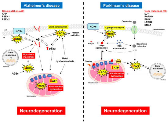 Specific patterns in ROS generation can support synaptic plasticity, guaranteeing the adequate spatial and temporal control over ROS level. When antioxidant defenses decline, as happens with aging, this may ultimately incite neuronal oxidative stress. Excessive ROS production has been associated with decreased performance in cognitive tasks, and oxidative stress is now recognized as a leading cause of neurodegeneration [125,126]. This hypothesis had already been suggested in 1954 by Denham Harman, who proposed the involvement of free radicals “in production of the aging changes associated with the environment, disease and an intrinsic aging process” [127]. Over time this assumption has been confirmed by several studies demonstrating a link between changes in redox status and age-dependent declines and, in particular, a close relationship has been identified with the most common neurodegenerative diseases, namely Alzheimer’s disease (AD) and Parkinson’s disease (PD) (Figure 2).