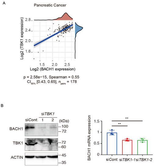 We analyzed the mRNA expression data from TCGA using the GEPIA database (Gene Expression Profiling Interactive Analysis) [72] and found that the expression of BACH1 and TBK1 are positively correlated in pancreatic cancer (Figure 1A). Since pancreatic cancer is a cancer of the digestive system, we also analyzed several other cancers of the digestive system and found similar results in bowel cancer, hepatocellular carcinoma and gastric cancer (Supplementary Figure S1A–C). To determine the roles of TBK1-mediated regulation of BACH1 in PDAC cells, we knocked down TBK1 by siRNA in human AsPC−1 PDAC cells. TBK1 knockdown led to the reduction of BACH1 protein and mRNA levels (Figure 1B). Because the change of the mRNA was smaller than that of the protein, a major regulatory mechanism of BACH1 by TBK1 may be at the protein level rather than the transcription level in AsPC−1 cells. Phosphorylation of BACH1 by TBK1 (L.L. et al., submitted) also suggested this possibility. In contrast, when TBK1 was knocked down in HEK293T cells, endogenous BACH1 protein and mRNA levels did not decrease (Supplementary Figure S2A). To test if TBK1 affects the subcellular distribution of BACH1, immunostaining was carried out. TBK1 knockdown resulted in a decrease of the endogenous BACH1 protein in AsPC−1 cells, but its subcellular distribution did not change (Supplementary Figure S2B). The cell counts did not change under the reduction of TBK1 (Supplementary Figure S2C). These results indicated that TBK1 is required for the accumulation of BACH1 protein and to promote BACH1 function in PDAC cells.