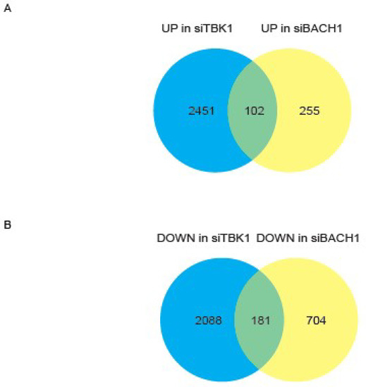 To further investigate the regulatory relationship between TBK1 and BACH1, we knocked down TBK1 in AsPC−1 cells and carried out an RNA-seq analysis. Using our previously published data of RNA-seq in AsPC−1 cells with or without BACH1 knockdown [46], there were 102 common upregulated genes and 181 common downregulated genes in TBK1-silenced and BACH1-silenced AsPC−1 cells (Figure 2A,B). A GO pathway enrichment analysis of these genes showed that terms related to oxidation-reduction process, regulation of transcription from RNA polymerase II promoter in response to iron, positive regulation of sequence-specific DNA binding transcription factor activity and cellular iron ion homeostasis were enriched in genes upregulated in response to TBK1 or BACH1 knockdown (Figure 2C). Considering that TBK1 is involved in iron metabolism [66], these results suggested the involvement of TBK1 in the regulation of BACH1 to tune iron homeostasis in AsPC−1 cells. Consistent with the reduction of BACH1 protein, its known target genes were increased in their expression, including HMOX1 and SLC40A1. On the other hand, the enrichment of terms related to positive regulation of endothelial cell proliferation, wound healing and positive regulation of cell migration in the genes whose expression was decreased (Figure 2D). The expression of mesenchymal genes, such as MMP7, SNAI2, and VIM, were decreased upon TBK1 knockdown (Supplementary Figure S3A). The expression of these genes is also reduced upon BACH1 knockdown in these cells [46], suggesting that TBK1 promotes metastatic process including cell migration via enhancing the function of BACH1.