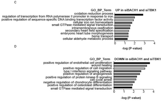 TBK1 and BACH1 regulate genes for iron homeostasis and cell migration. (A,B), AsPC−1 cells with TBK1 siRNA or control siRNA were analyzed with RNA-sequence, resulting in upregulated (A) or downregulated (B) genes with TBK1 knockdown. These genes were compared with those affected with BACH1 knockdown, pointing to 102 common upregulated genes and 181 common downregulated genes in TBK1-silenced and BACH1-silenced AsPC−1 cells. (C,D), Top 10 Gene Ontology (GO) biological process terms enriched in the upregulated genes (C) or downregulated genes (D) using DAVID for each considered group.