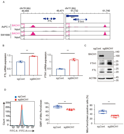 A reanalysis of ChIP-seq data of BACH1 in AsPC−1 cells [46] showed direct binding of BACH1 to FTL and FTH1 encoding ferritin subunits (Figure 3A). Ferritin mRNAs were increased upon knockout (Figure 3B) or knockdown (Supplementary Figure S3B) of BACH1 in AsPC−1 cells. Correspondingly, ferritin heavy and light chain proteins were increased in AsPC−1 cells with the knockout of BACH1 (Figure 3C). While BACH1 also directly binds with SLC40A1 encoding ferroportin, its mRNA was not increased (Supplementary Figure S3C,D). Two cytoplasmic iron regulatory proteins (IRP1 and IRP2) post-transcriptionally regulate cellular iron metabolism, including translational inhibition of ferritin mRNAs when the iron is reduced [20,73,74]. IRP2, but not IRP1, was also decreased under the situation of BACH1 knockdown and knockout (Supplementary Figure S3B,E), suggesting a direct or indirect regulation of IRP2 expression by BACH1.