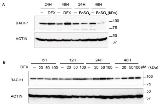 Since iron and heme play key roles in the regulation of BACH1 [43,75,76,77], the changes in BACH1 protein and mRNA in response to fluctuations of iron in AsPC−1 and SW1990 derived from PDAC patients was examined with ferrous sulfate (FeSO4) or iron chelator deferasirox (DFX). BACH1 protein was increased with DFX and decreased with FeSO4 (Figure 4A,B; Supplementary Figure S6A). Consistent with the protein amount, BACH1 mRNA increased in response to DFX after 12 or 48 h. Among downstream target genes of BACH1, HMOX1 mRNA decreased with DFX (Figure 4C; Supplementary Figure S6B). Taken together with the enhanced BACH1 protein degradation by heme [77], these results demonstrated that iron deficiency, which leads to a decrease in heme, induces the expression of BACH1 at both transcriptional and post-translational steps.