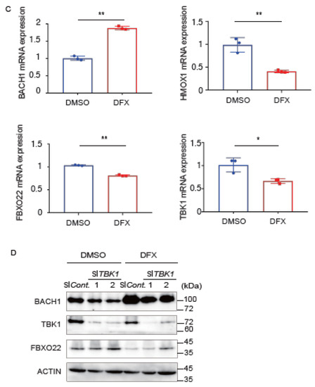 BACH1 is polyubiquitinated by the E3 ligase adaptor proteins F-box protein 22 (FBXO22) [47]. The mRNA of FBXO22 decreased with DFX (Figure 4C; Supplementary Figure S6B), which suggested that FBXO22-dependent BACH1 degradation was decreased under this condition, contributing to the accumulation of BACH1 protein. The next question is how TBK1 responds to a reduction of iron. TBK1 mRNA and protein were decreased when AsPC−1 cells were treated with DFX (Figure 4C,D; Supplementary Figure S6B). This observation led to the question of whether TBK1 is involved in the accumulation of BACH1 protein upon iron chelation. DFX still increased BACH1 protein even when TBK1 was reduced by siRNA (Figure 4D). However, the accumulation of BACH1 was reduced compared with DFX alone. FBXO22 protein was also reduced by DFX, which was not affected by TBK1 knockdown (Figure 4D). When taken together, these observations suggested that TBK1 and iron constitute two independent, parallel pathways to control BACH1 expression in PDAC cells. TBK1 promotes the accumulation of BACH1 protein whereas iron inhibits its accumulation.