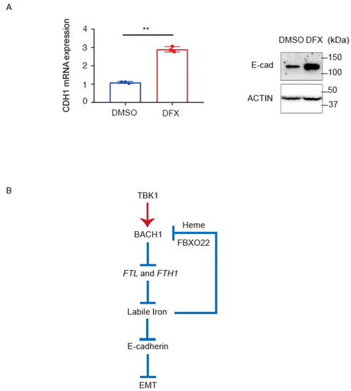 While BACH1 reduces the expression of CDH1 encoding E-cadherin in PDAC cells to promote metastasis [46], the specific mechanism remains unclear. A recent report pointed to the role of iron in promoting EMT in HepG2 cells [78]. When taken with this report, the above observations raise the possibility that the regulation of CDH1 expression involves iron. Indeed, E-cadherin mRNA and protein were both increased by the DFX treatment (Figure 5A). The increased expression of E-cadherin upon BACH1 knockdown may involve iron reduction caused by increased expression of ferritin (Figure 5B).