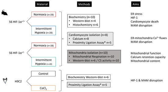 Experimental design: repartition of wild-type mice SwissxSV129 (HIF-1α+/+) and HIF-1α heterozygous mice (HIF-1α+/−) in normoxia and intermittent hypoxia during 21 days before heart harvesting, in order to explore the impact of IH on endoplasmic reticulum (ER), ER-mitochondria Ca2+ fluxes, mitochondria and mitochondria-associated ER membrane (MAM) homeostasis (biochemical analysis, cardiomyocyte isolation and mitochondria isolation); in vitro model using H9C2 cardiomyoblast treated, or not, with CoCl2 (100 uM, 1 h), in order to validate the impact of HIF-1 activation on MAM integrity (Western blot and proximity ligation assay).