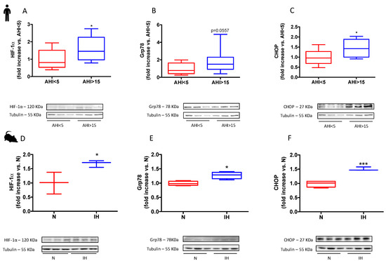 HIF-1 and ER stress in humans and mice under IH. Hypoxia inducible factor-1α (HIF-1α), glucose regulated protein-78 KDalton (Grp78) and C/EBP homologous protein (CHOP, copyright from Moulin S. et al., Can. J. Cardiol, 2020) expression relative to Tubulin. Patients were stratified in quartiles of AHI (n = 10 each), and lowest and highest quartiles were compared. Quantification and representative images for HIF-1α (A), Grp78 (B), and CHOP (C), in patients, respectively; quantification and representative images for HIF-1α (D), Grp78 (E), and CHOP (F), in mice, respectively. Data are expressed in median and min to max values and analyzed using t-test; * p < 0.05, *** p < 0.001.