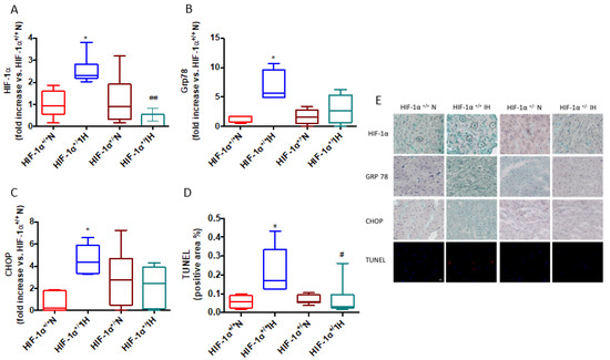 Western blot analyses of HIF-1α, CHOP, Grp78, and Grp75 were performed on whole protein extracted from hearts of N and IH mice as previously described [10]. Immunochemistry analyses of HIF-1α, Grp78 and CHOP were performed on heart cryosections of HIF-1α+/− and HIF-1α+/+ as previously described [10]. Cryosections were also used to detect apoptosis using terminal deoxynucleotidyl transferase-mediated dUTP nick end-labeling assay (Abcam, Cambridge, UK), following the manufacturer’s instruction (for more information, see Supplemental Material).