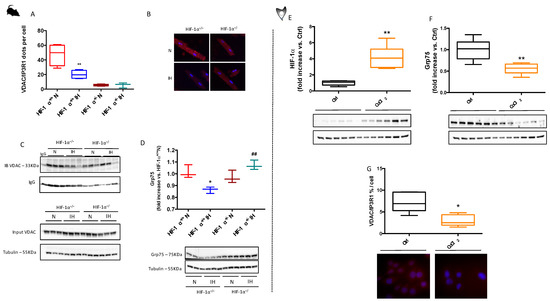 MAM disruption and consecutive alterations of calcium homeostasis are known to be involved in cardiomyocyte death. Here, under IH, proximity ligation assay and immunoprecipitation demonstrated a decrease in VDAC and IP3R1 proximity (Figure 4A,B) and interaction (Figure 4C). Interestingly, in HIF-1α+/−, mice, IH did not affect VDAC and IP3R1 interaction. Figure 3D demonstrates that IH also decreased Grp75 expression in HIF-1α+/+ mice, which was restored in HIF-1α+/−. Taken together, these results indicate that chronic IH leads to HIF-1-dependent-MAM disruption. In accordance, using H9c2 stimulated with CoCl2 that drastically increases HIF-1α expression (Figure 3E), we observed a decrease in Grp75 expression (Figure 4F), as well as a decrease in VDAC and IP3R1 proximity (Figure 4G).