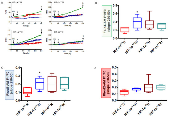 IH-induced Ca2+ homeostasis alteration is mediated by HIF-1. Mitochondrial-associated ER membrane calcium fluxes between ER and mitochondria in HIF-1α+/+ and HIF-1α+/− mice submitted to normoxia (N) or chronic intermittent hypoxia (IH). Illustration of calcium fluorescence after histamine-induced ER-calcium leakage using Fluo 4-AM (cytosol, green), Fluo 5-AM (ER, blue) and Rhod 2 (mitochondria, red) recorded between 50 (a) and 250 (b) seconds after (A), n = 7–8. Quantification of fluorescence F1 relative to F0 recorded in cytosol (B), ER (C), and mitochondria (D). Data were expressed in median and min to max values and analyzed using Kruskal–Wallis followed by Dunn’s test; * p < 0.05 vs. N.