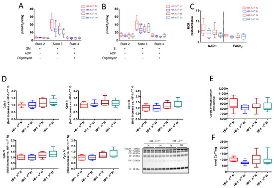 IH-induced mitochondrial respiration alteration is mediated by HIF-1. Mitochondrial oxygen (O2) consumption measured on isolated mitochondria from HIF-1α+/+ and HIF-1α+/− mice submitted to chronic intermittent hypoxia (IH), following sequential addition of substrate (state 2), ADP (state 3, maximal respiration) and oligomycin (state 4). Quantification of O2 consumption for NADH-linked mitochondrial respiration (complex I-glutamate-malate GM) (A), and for FADH2-linked mitochondrial respiration (complex II-succinate in presence of complex I inhibition by rotenone) (B). Respiratory control ratio (RCR) calculated as the ratio of O2 consumption in state 3 relative to state 4 for NADH and FADH2-linked mitochondrial respiration (C), n = 7–10. Quantification of each respiratory chain complex and representative image (D), n = 6. Citrate synthase activity (E), n = 7–10. Calcium retention capacity expressed in nmol Ca2+ per mg of mitochondrial protein content, on isolated mitochondria in presence of cyclosporin A (CsA, 1μM) (F). Data are expressed in median and min to max values and analyzed using Kruskal–Wallis followed by Dunn’s test; * p < 0.05, ** p < 0.01 vs. N.