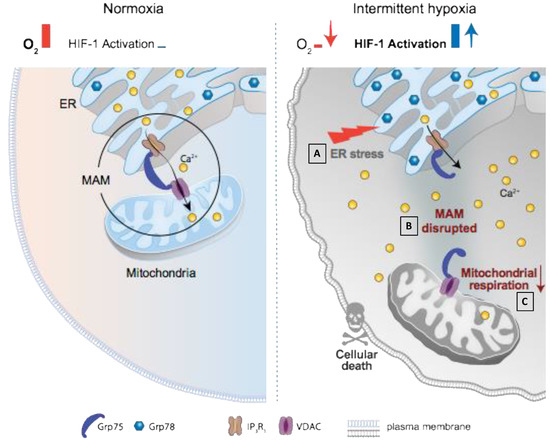 Graphical abstract. Normoxia is represented on the left panel. The communication between endoplasmic reticulum (ER) and mitochondria through the mitochondria-associated ER membrane (voltage anion dependent channel (VDAC), Inositol tri-Phosphate Receptor 1 (IP3R1), and glucose regulated protein-75 KDalton (Grp75)) maintains Ca2+ homeostasis, ER homeostasis and cell life. On the right panel, intermittent hypoxia (IH) induces cell death. IH leads to HIF-1 activation responsible for ER stress (A), MAM disruption (B), Ca2+ homeostasis alteration, mitochondrial dysfunction (C), and cardiomyocyte death.