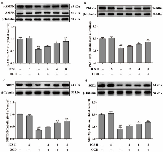 3.6. ICS II Suppressed OGD-Induced Mitochondrial Oxidative Stress by Activating AMPK/PGC-1α/SIRT3 Signaling Pathway