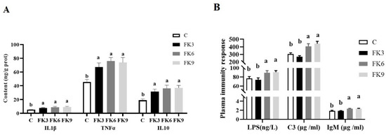 With the exception of LPS and complement C3 in the FK3 group, pro- and anti-inflammatory and immune responses were elevated in the FK groups. In particular, the proinflammatory cytokines IL1β, TNFα, and the anti-inflammatory cytokine factors IL10 in the distal intestinal of the FK groups were significantly increased compared to the C group (Figure 3A, p < 0.05). The immunity parameters, including plasma LPS, complement C3 and IgM of FK6 and FK9 groups were significantly higher than those in the control and FK3 group (Figure 3B, p < 0.05).