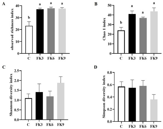 The alpha diversity of microbiota in the distal intestinal of largemouth bass fed diets with various FK levels. (A) Observed richness; (B) Chao index; (C) Shannon index; (D) Simpson index. Graph bars labelled with different letters “a” or “b” on top indicate significant results, whereas bars with the same letter correspond to results that show no significant differences among groups (p < 0.05, means ± SEM, n = 6).