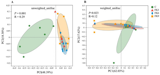 Results from the permutation multivariate analysis of variance (PERMANOVA) analysis of weighted and unweighted UniFrac showed significant differences in gut micro-biota between dietary treatments (p < 0.05, Figure 6). Accordingly, the principal coordi-nates analysis (PCoA) plots based on Unweighted UniFrac showed that fish fed FK groups tended to cluster together and seemed to be separated from those fed the C group (Figure 6A), while all samples tended to cluster together based on the PCoA plots of Weighted UniFrac (Figure 6B).