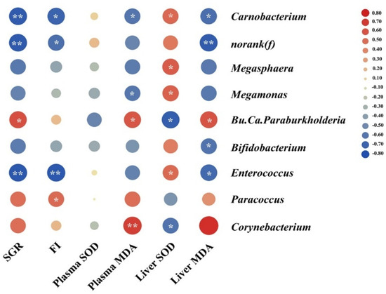 For the results of Pearson correlation analysis, SGR and FI showed a strong negative relationship with the relative abundance of Carnobacterium, Enterococcus and norank(f) (family) (p < 0.01, Figure 8). The plasma and hepatic MDA levels showed positive correlations with the relative abundance of Corynebacterium, Bu.Ca.Paraburkholderia but negatively related with Carnobacterium (p < 0.01, Figure 8). Further, the hepatic MDA level showed negative correlations with the relative abundance of norank(f) (family), Bifidobacterium and Enterococcus. Additionally, the liver SOD levels showed a clear positive correlation with the relative abundance of Carnobacterium, Megasphaera, Megamonas and Enterococcus, but negatively correlated with Bu.Ca.Paraburkholderia and Corynebacterium.
