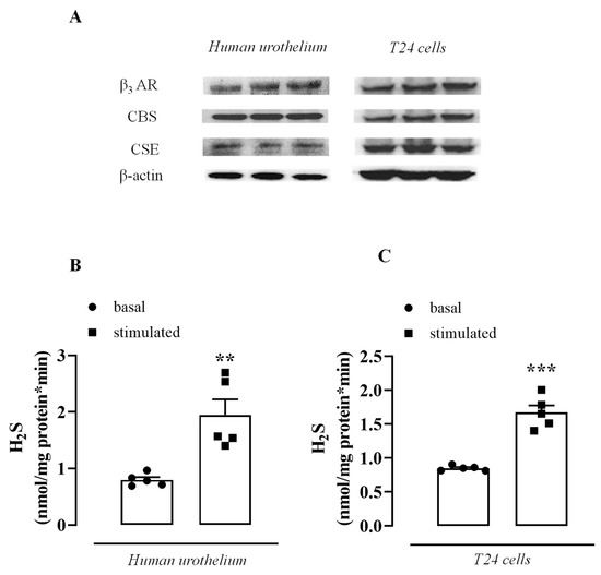 β3 AR and H2S signaling in the human urothelium and T24 cells. (A) Representative Western blot for β3 AR, CBS, and CSE in the human urothelium and T24 cells. β-actin his considered the housekeeping protein. (B) Generation of basal or stimulated (L-cysteine addition) H2S in human urothelium (** p < 0.01). (C) Generation of basal or stimulated (L-cysteine addition) H2S in T24 cells (*** p < 0.001).