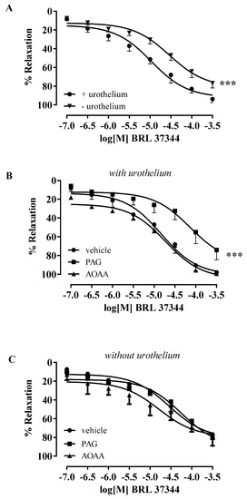 On the stable tone of carbachol, a cumulative concentration–response curve for BRL 37344 (0.1–300 µM) was performed on strips with intact urothelium or in urothelium-denuded strips. BRL 37344 elicited significantly higher concentration-dependent relaxation in strips with intact urothelium (*** p < 0.001, Figure 2A). To evaluate the involvement of H2S, the strips were incubated with AOAA (CBS inhibitor) or PAG (CSE inhibitor). The BRL 37344 relaxant effect in isolated strips with intact urothelium was significantly reduced following CSE inhibition with PAG, while no changes were observed after AOAA treatment (*** p < 0.001, Figure 2B). Conversely, in denuded strips, neither the CBS nor the CSE inhibitors modified the relaxant effect of BRL 37344 (Figure 2C).
