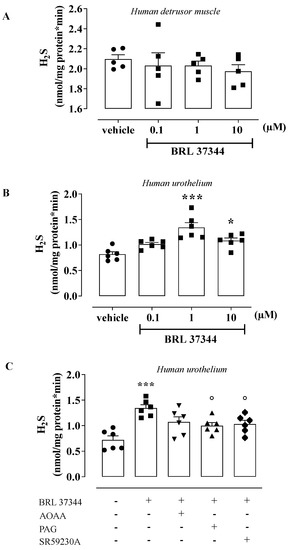3.2. BRL 37344-Induced Relaxation Involves H2S Production in Human Bladder Strips