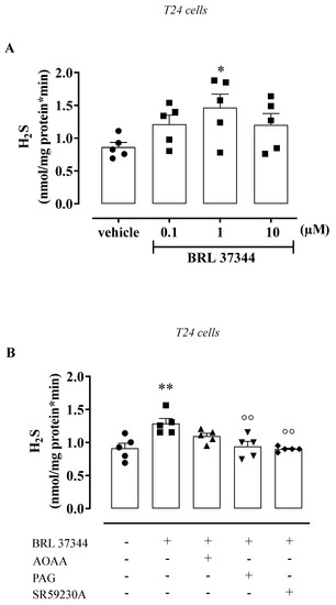 T24 cell lines were cultured under a humidified atmosphere of 5% CO2 at 37 °C in Dulbecco’s Modified Eagle Medium (DMEM) enriched with 10% heat-inactivated fetal bovine serum (FBS) (Invitrogen, Life Technologies, Milan, Italy), 1.5 mM L-glutamine, 100 units/mL penicillin, and 100 μg/mL streptomycin [12]. Treatments of cells were performed by replacing the culture medium with those containing increasing concentrations of BRL 37344 (0.1–100 µM), PAG (10 mM), SR59230A (10 µM), or AOAA (1 mM).