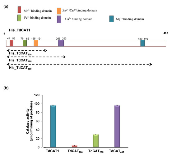 To confirm the presence of those putative cation binding domains, we generated three different deleted forms, which are TdCAT200 (containing the first 200aa), TdCAT295 (containing the first 295aa), and TdCAT460 (containing the first 460 aa) (Figure 2a). After the production and purification of those forms, we measured their catalytic activities in the absence of divalent cations. Interestingly, TdCAT200 has a very weak basal activity (4.011 µmol/min/mg of protein), whereas TdCAT295 has a better catalytic activity (29.41 µmol/min/mg of protein), while TdCAT460 and the non-truncated protein TdCAT1 have the same catalytic activity (96.27 µmol/min/mg of protein) (Figure 2b). This result could be explained by the fact that TdCAT1 protein contains one catalase domain (Pfam Id PF00199, 18–399 aa) and catalase-related immune-responsive (Pfam Id PF06628.11, 421–486; data not shown) as revealed by HMMER database. Those results were also shown for some OsCATs demonstrating that the presence of the whole catalase domain is essential for protein activity [41]. Therefore, the entire catalytic domain seems to be important for the catalytic activity of TdCAT1.