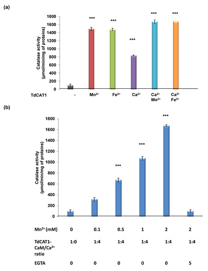 Effects of Mn2+ cations and CaM/Ca2+ complex on TdCAT1 activity. (a) Ca2+ cations further enhance catalase activity of TdCAT1 in presence of Mn2+ and Fe2+. (b) Stimulatory effect of TdCaM1.3/Ca2+ complex on His_TdCAT1 activity in the same buffer conditions using increasing concentrations of Mn2+ and in presence of TdCAT1/TdCaM1.3 ratio molar of 1:4. All data are mean values ± S.E of initial rate from three independent assays. (***) indicates value significantly different from the control. Statistical significance was assessed by applying the ANOVA test with p < 0.005.